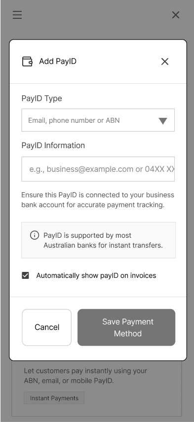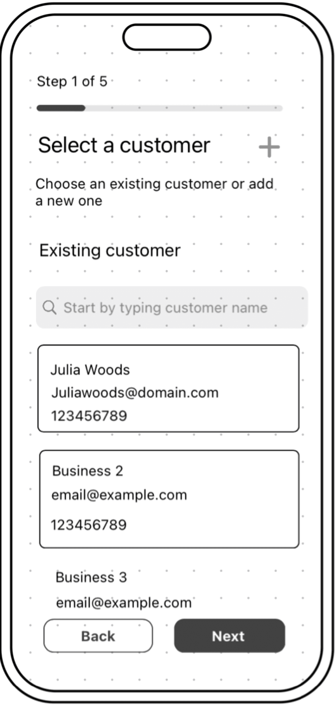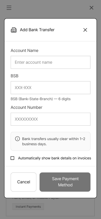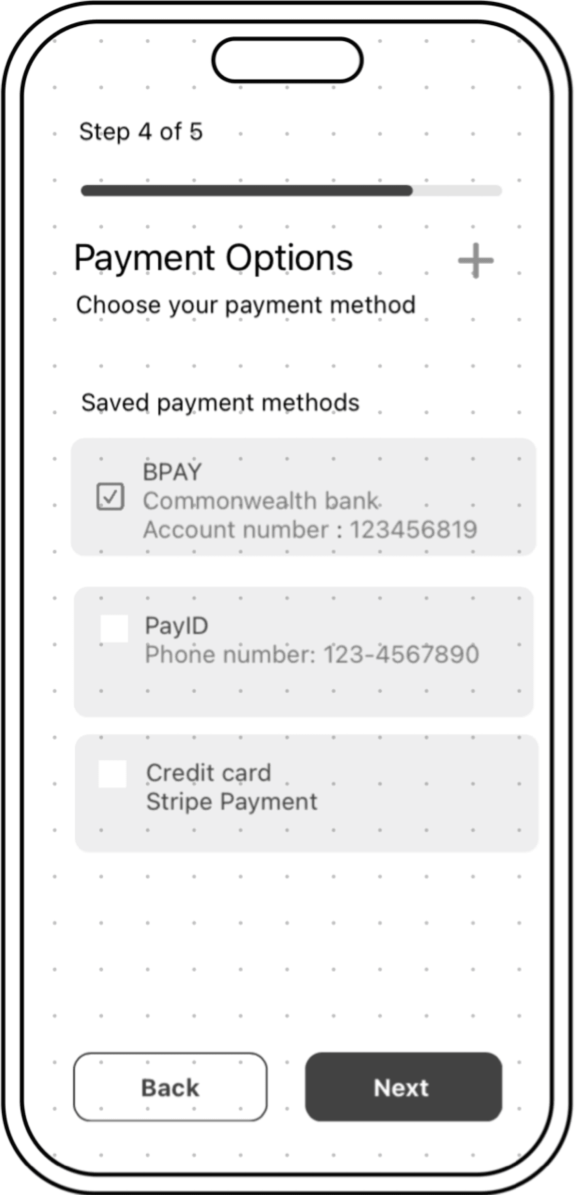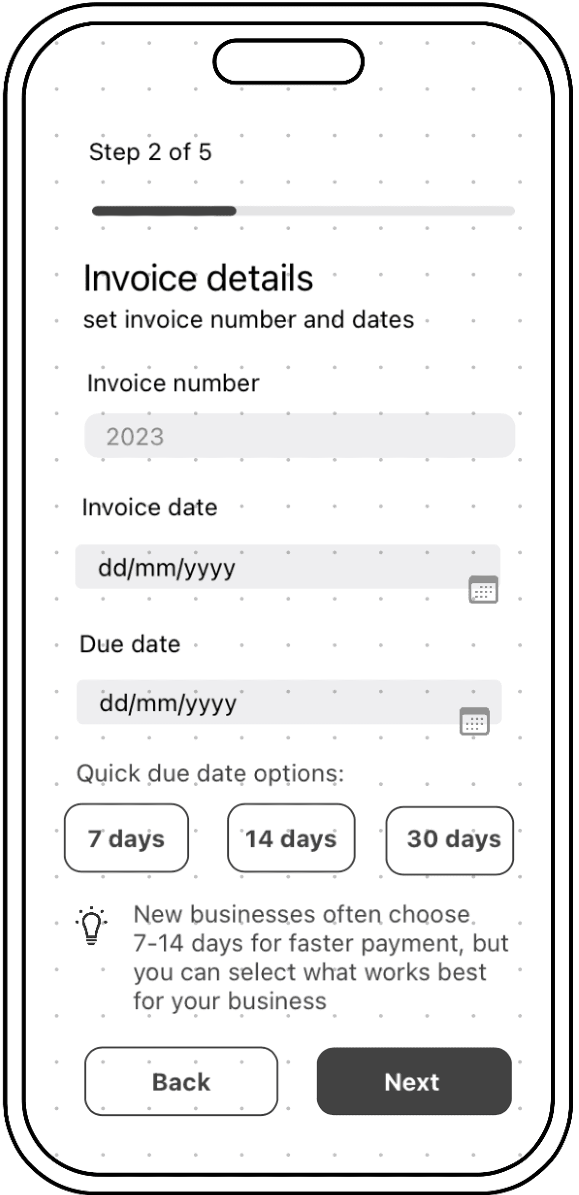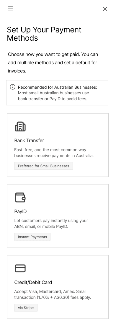While each step of the invoice generator felt organised, I identified that separating payment selection into its own step was unnecessary within this flow. I suggested relocating payment options into the broader business setup settings. Users are unlikely to change their bank or payment details frequently, making it more of a recurring interruption than a meaningful step within the workflow.