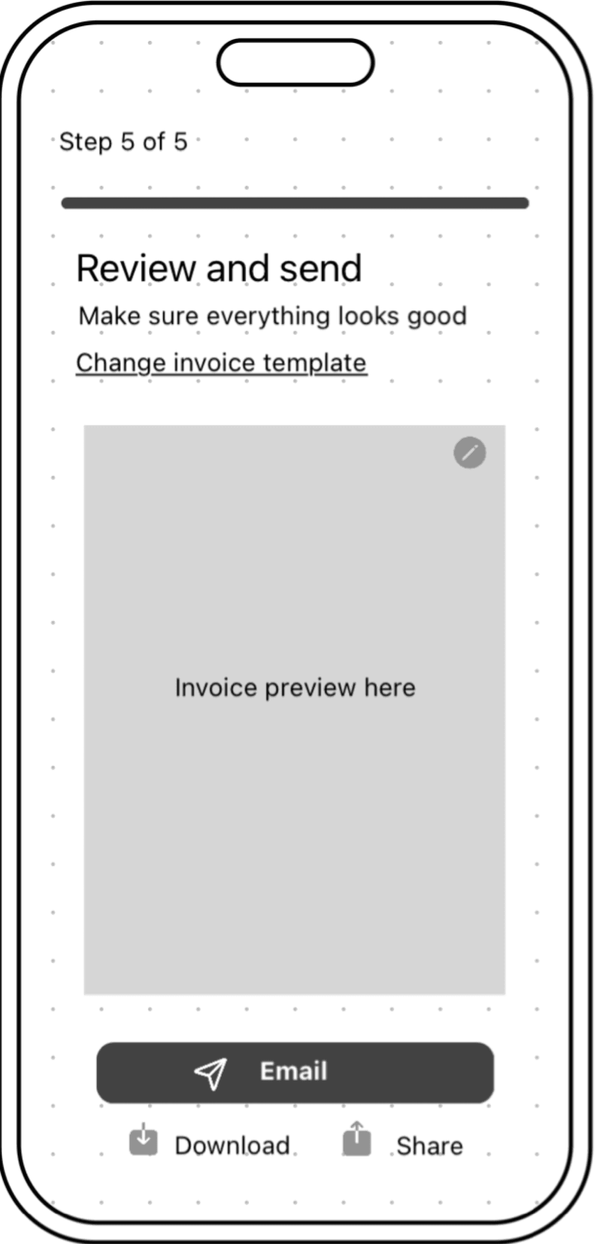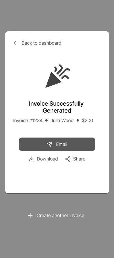 I proposed adding a direct email option within the final preview step, alongside share and PDF download functionality. Instead of simply generating an invoice, users could now complete the full task within the same flow — whether sending immediately, sharing externally, or downloading for later use. I also introduced a “Create another invoice” option at this stage, allowing users to begin a new invoice without breaking momentum.