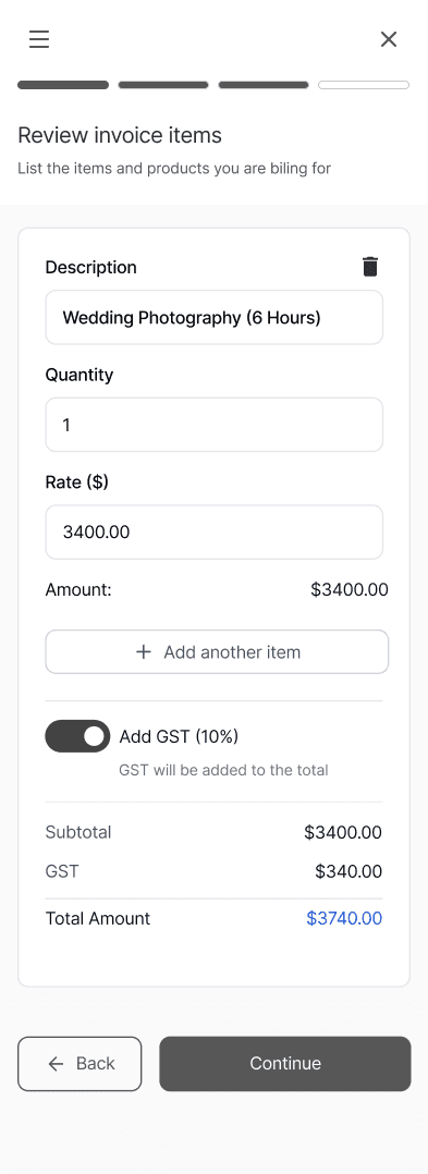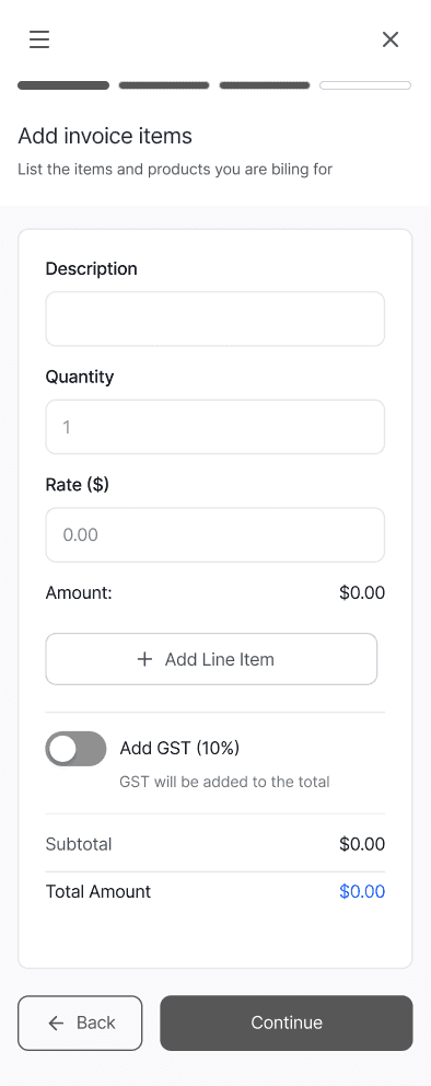 Because the invoice form relied on real-time calculations and dynamic updates, certain interactions needed to be simplified to maintain performance across desktop and mobile. In particular, the line item section required careful structuring to avoid lag or unnecessary system complexity.