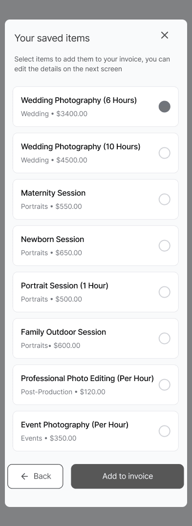 In the initial version, line items were entered manually for each invoice. To reduce repetitive input and better support recurring workflows, I introduced the ability for users to save frequently invoiced items. This allowed them to quickly select saved services instead of having to enter details each time.