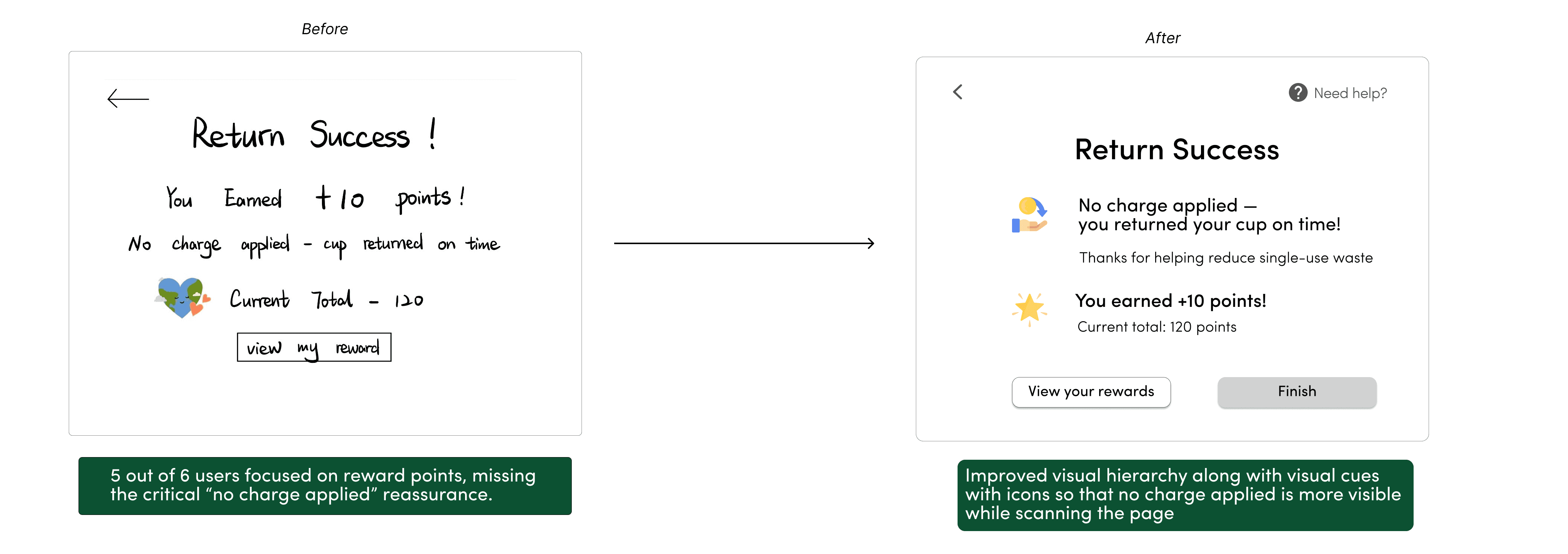 Visual hierarchy matters: “No charge applied” must outweigh secondary rewards to reduce anxiety.