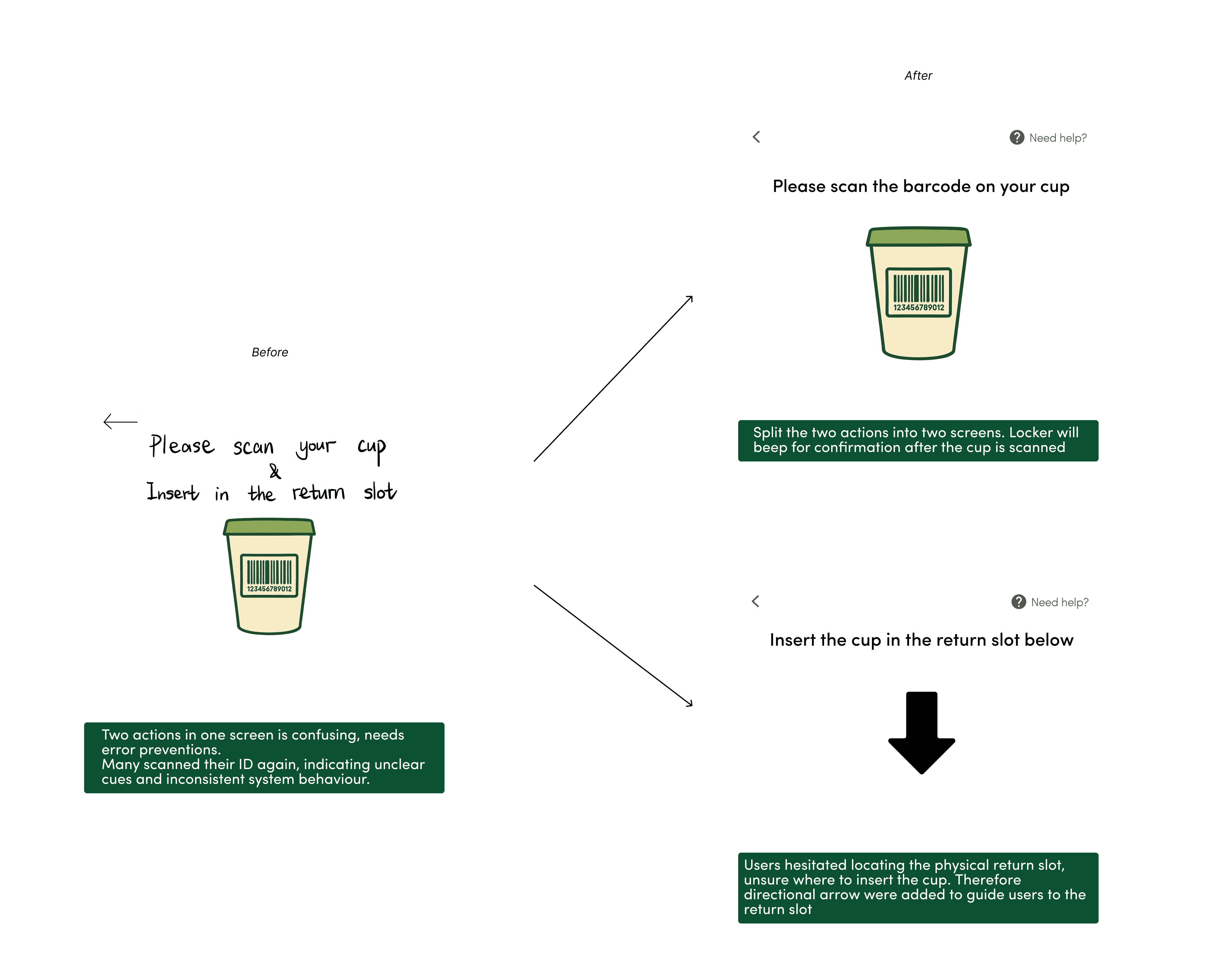 Directly responding to key pain points from user interviews — carrying an extra cup, lack of washing facilities, and hygiene concerns — we explored a borrow-and-return reusable cup system, where cups are professionally cleaned and sanitised before being recirculated, much like a library book model