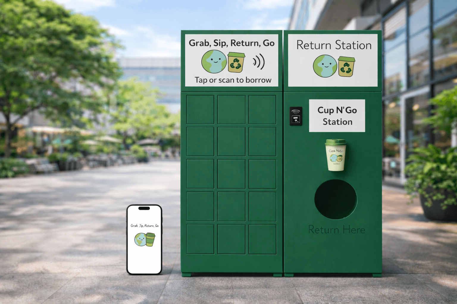 At the core of the service are smart borrow-and-return lockers, strategically placed across campus. There are more return stations than borrow stations, reducing friction and making it easy to return a cup wherever students already are.
