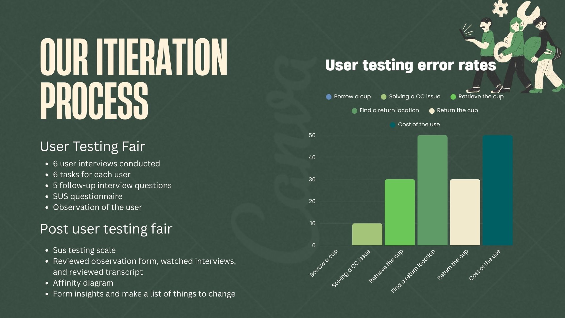 We synthesised our findings from usability testing and mapped error rates across each task to understand where users struggled most within the Cup n’ Go system.
