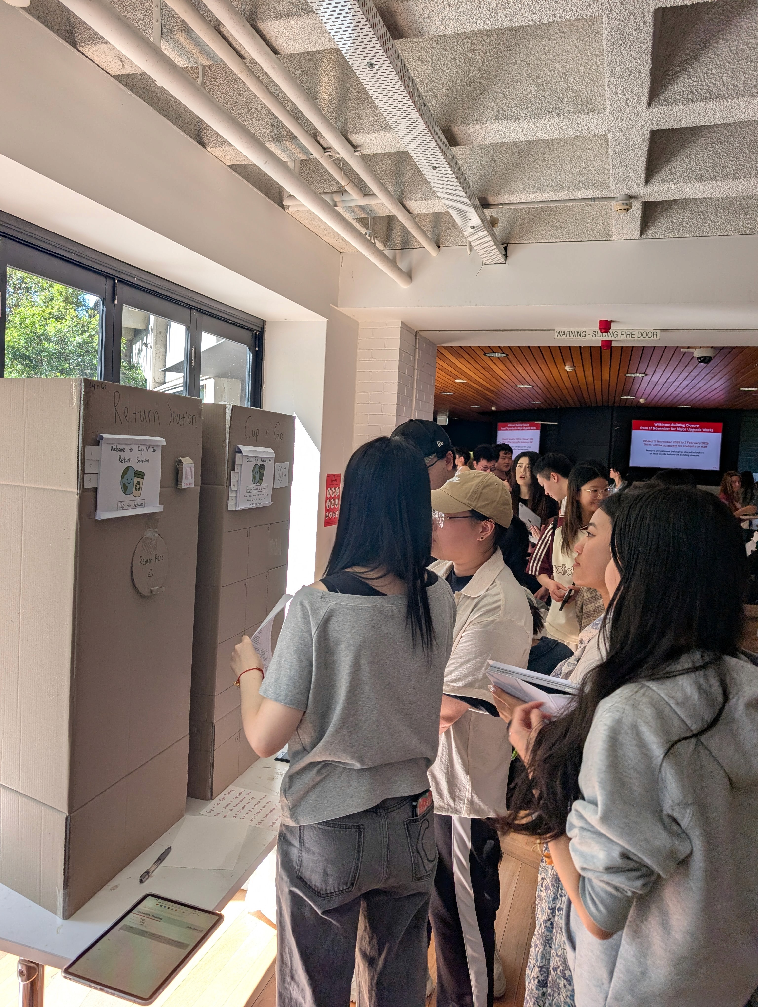 To test whether the idea would work in real life, we intentionally stayed low-fidelity, focusing on user behaviour, feasibility, and ease of use. We built two large-scale physical prototypes — a borrow locker and a return locker, using paper and cardboard, collectively referred to as Cup n’ Go. This allowed participants to interact with the whole product, not just the touchscreen.