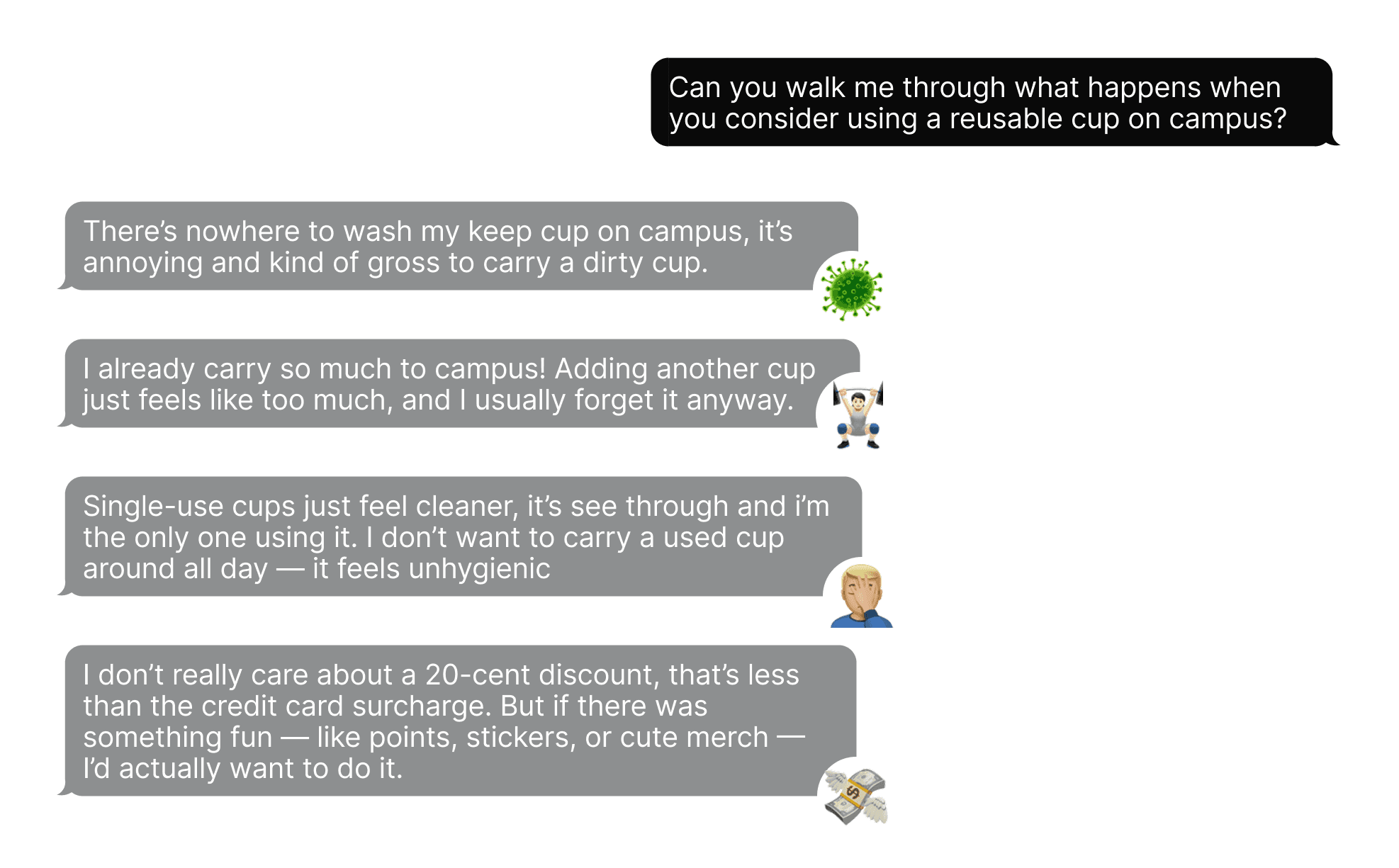 While reusable water bottles succeed because they are convenient and low-maintenance, our interviews revealed that reusable cups face a very different set of challenges. These conversations surfaced practical, emotional, and habitual barriers that weren’t fully visible through background research alone